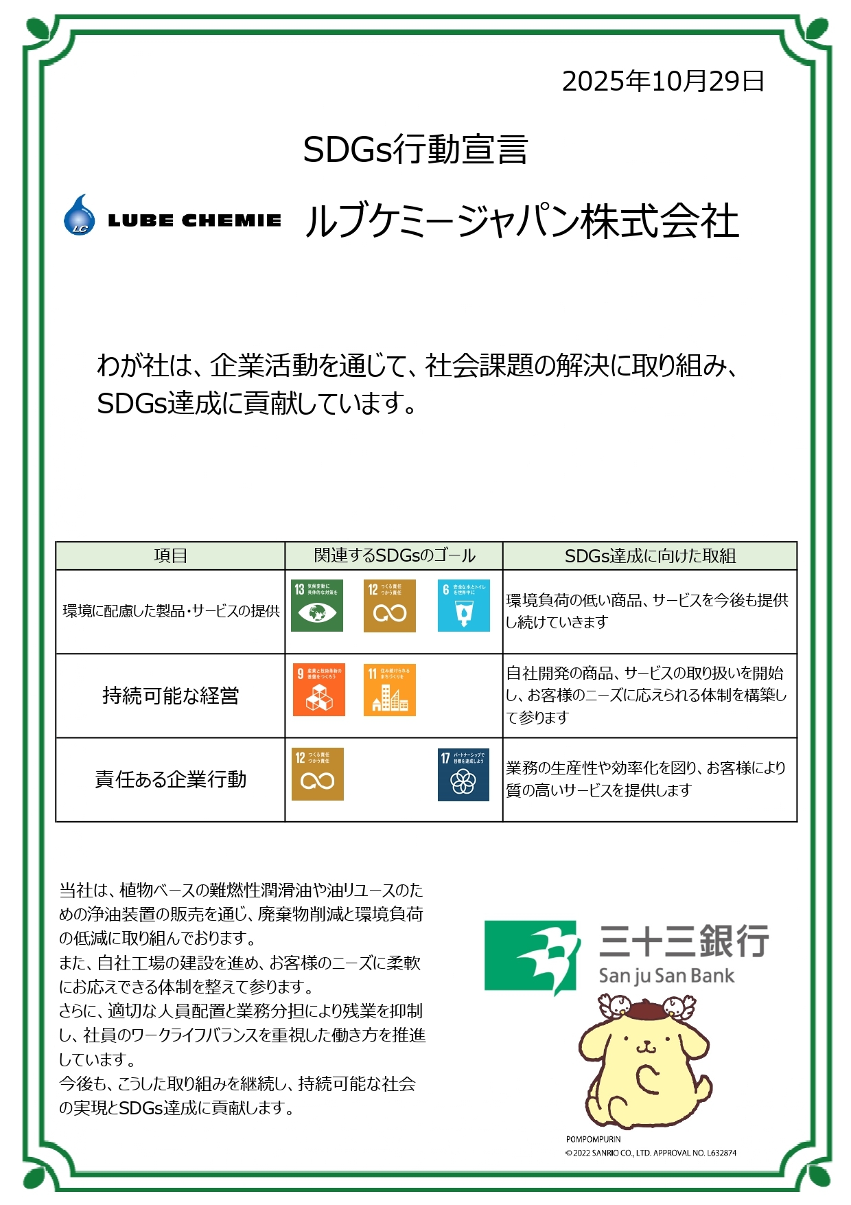 この宣言書は、当社が環境保全・地域社会への貢献・働きやすい職場づくりなど、事業活動を通じて果たすべき責任と目標を明確にしたものです。